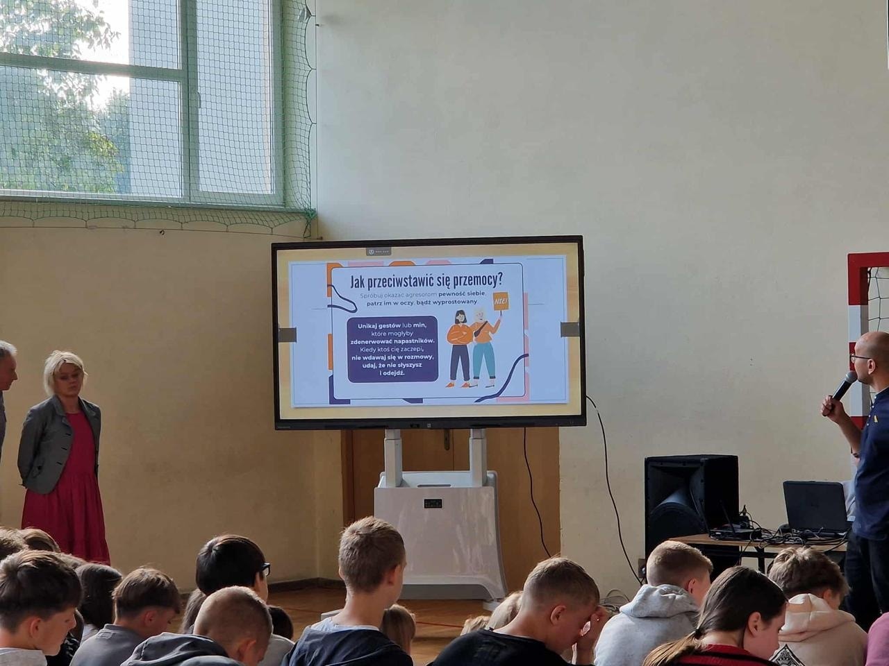 Klasy I–III uczestniczyły w warsztatach edukacyjnych, w których wykorzystano projekcję materiałów na dużym ekranie. Spotkanie miało charakter dyskusyjny – dzieci mogły podzielić się swoimi spostrzeżeniami, opowiedzieć o własnych doświadczeniach i wspólnie zastanowić się, jak reagować w sytuacji przemocy. Szczególną uwagę poświęcono również cyberprzemocy i zagrożeniom związanym z korzystaniem z Internetu, które dotykają nawet najmłodszych użytkowników.