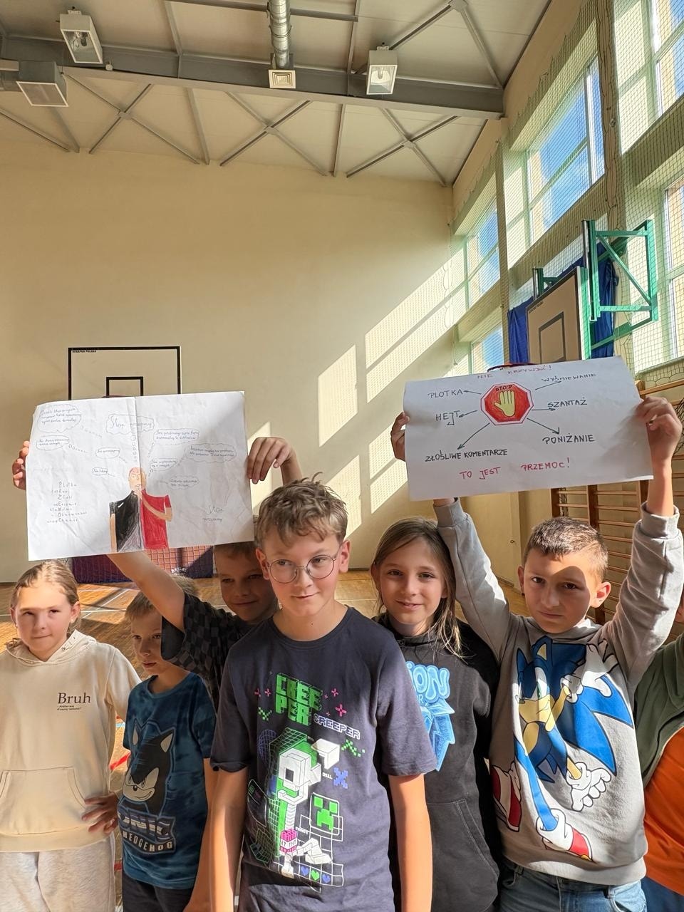 Po wykładach odbył się Wielki Turniej Wiedzy, w którym uczniowie mogli sprawdzić swoje wiadomości dotyczące przemocy, cyberprzemocy oraz bezpiecznego korzystania z mediów cyfrowych. Rywalizacja miała charakter edukacyjny, a jednocześnie integracyjny – pozwoliła utrwalić treści w przystępny i angażujący sposób. Finałowym akcentem była wystawa plakatów przygotowanych przez uczniów klas IV–VIII, które stanowiły artystyczne podsumowanie całego tygodnia. Nie zabrakło również wspaniałych prac młodszych uczniów – dzieci z klas I–III wykazały się dużą kreatywnością i wrażliwością, tworząc prace podkreślające wagę koleżeństwa, przyjaźni i wzajemnego szacunku.
